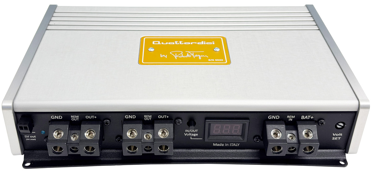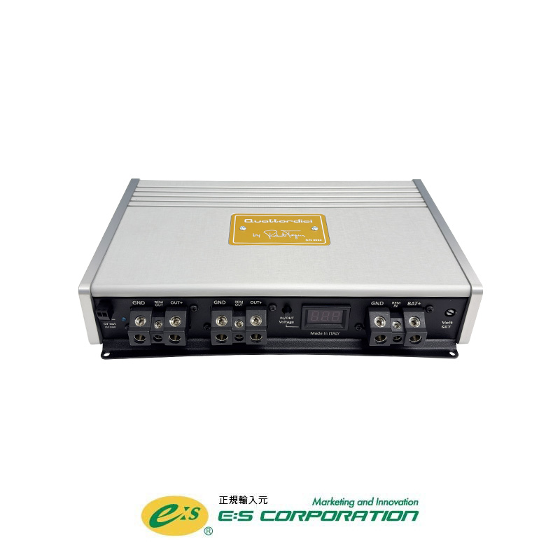 Quattordici (クワットルディチ)(受注発注品)  JAN: 4532817517311  販売価格(税込):  ¥396,000  税抜価格:¥360,000   ●仕様:オーディオレギュレーター(安定化電源)●12V出力2系統●5V出力1系統●入力電圧:8.5V~17V●出力電圧:最大16V●アイドリング電流0.1mA以下(無負荷時)●出力電流:最大200A●電力処理能力:連続750W/最大1600W(10秒間)●電圧ディスプレイ装備●サイズ(幅×奥行×高さ):280×190×60mm●質量:2.98kg●実装ヒューズ:35A×3※受注発注品 audio solutionの安定化電源Quattordici (クワットルディチ) Quattordici (クワットルディチ) は、イタリアにてハンドメイド生産された昇圧式(STEP-UP)DC-DCコンバーターです。 CNC加工されたアルミニウムシャーシに収められ、落ち着いたデザインで、最高の長期的な性能を確保するために、高品質なコンポーネントで堅牢に構築、大型の出力フィルターによる「クリーン」な電力出力を実現しています。 銅厚 105μmの金メッキ基盤にPTH(スルーホール)とSMD(表面実装)部品を組み合わせ、非常に大容量の Nichicon製コンデンサを採用。2系統の出力端子の他、デジタルプレーヤーや他のデバイス用の5V / 4A の出力を搭載。入力/出力電圧を表示するディスプレイも装備。通常の音楽再生で最大 1600W rmsのオーディオシステムを駆動可能。Duecento や Quattrocentoを最大 3台まで駆動できるように設計されています。